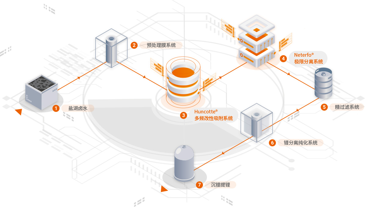 萊特萊德針對(duì)鹽湖鋰資源的技術(shù)路線,自主研發(fā)出Huncotte多頻改性吸附系統(tǒng),利用獨(dú)有的Neterfo極限分離系統(tǒng)對(duì)物料進(jìn)行純化,最終獲得純凈鋰液用于工業(yè)生產(chǎn)。