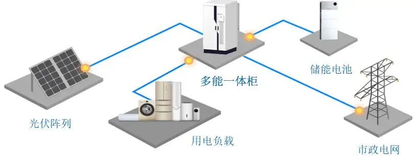 項(xiàng)目太陽(yáng)能光伏所發(fā)電力通過(guò)直流線纜傳輸?shù)蕉嗄茈姵匾惑w化柜,多能電池一體化柜實(shí)現(xiàn)電池光伏控制器、并離網(wǎng)、EMS、配電、空調(diào)、消防一站式集成,實(shí)現(xiàn)儲(chǔ)能系統(tǒng)自主調(diào)節(jié)儲(chǔ)能放電,做到即插即用。