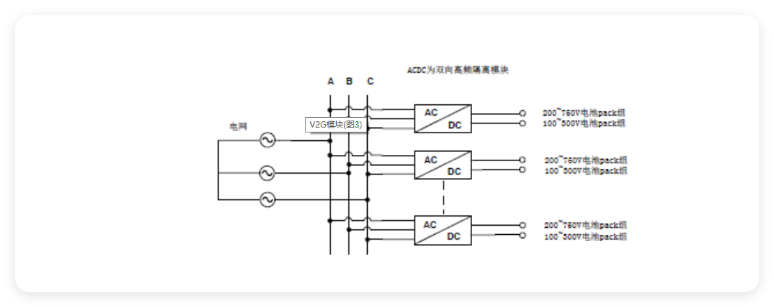 高頻隔離技術(shù)取代傳統(tǒng)的工頻隔離方式,顯著提高了系統(tǒng)效率,降低了系統(tǒng)成本,并減小了占地面積,實現(xiàn)了節(jié)能增效的目標。以下為雙向高頻隔離電源用于電池化成與分容的解決方案示意圖,電池pack分組接入模塊,省去了工頻變壓器,系統(tǒng)效率更高,尺寸更小。