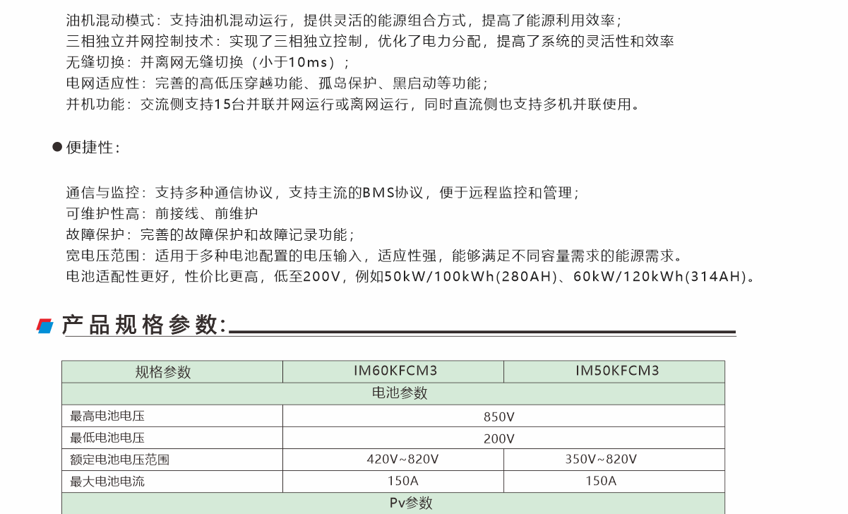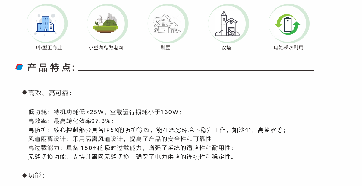 該系列主要針對(duì)中小型儲(chǔ)能微電網(wǎng)開發(fā)的一款高效、高可靠混合儲(chǔ)能逆變器,支持光伏接入,內(nèi)含并離網(wǎng)切換裝置,支持多臺(tái)并聯(lián)運(yùn)行,支持油機(jī)混動(dòng)運(yùn)行,支持并離網(wǎng)快速切換工作。